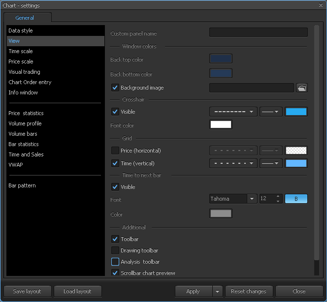 - Additional - activate Chart toolbar, Scrollbar, Scrollbar chart preview, Drawing and Analysis toolbars. If Scrollbar option is checked, you can enable the Scrollbar chart preview.