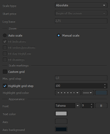 - Scale type - select the type of scale price and start price for the chart: Absolute, Relative and Logarithmic.
