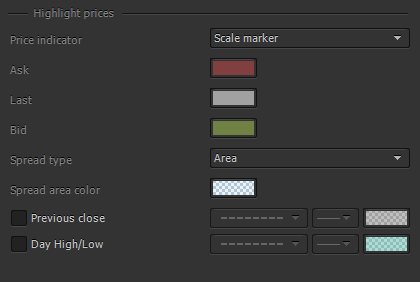 - Day High/Low lines - type and color. Only for Time, Tick, Price range and Heikin Ashi aggregation types.