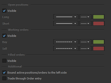 - Previous close line - type and color. Only for Time, Tick, Price range and Heikin Ashi aggregation types.